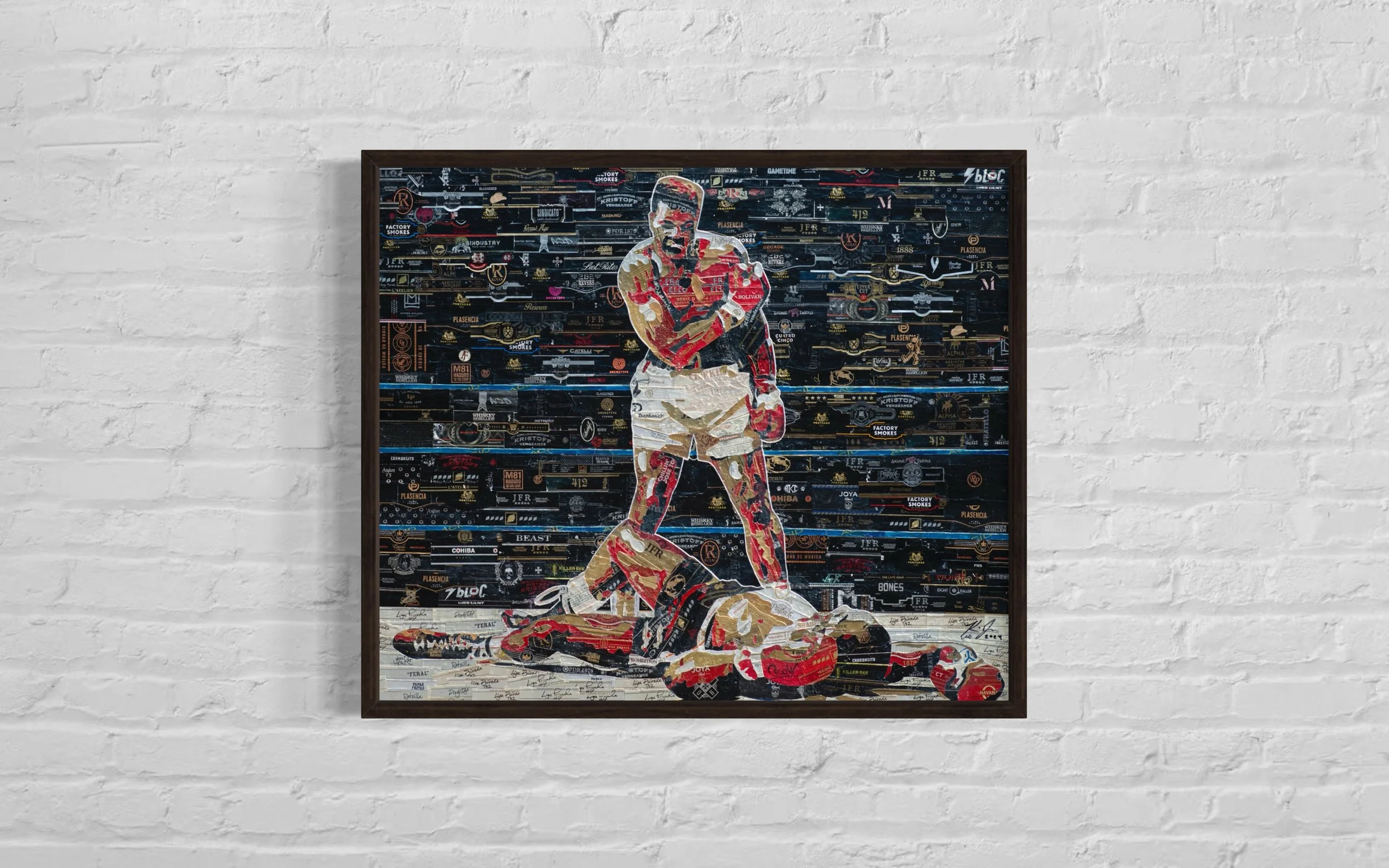 Made entirely from reclaimed cigar labels, every strip of paper adds to the energy, grit, and history captured in this iconic image. Bold, powerful, and unmistakable — just like Ali himself.