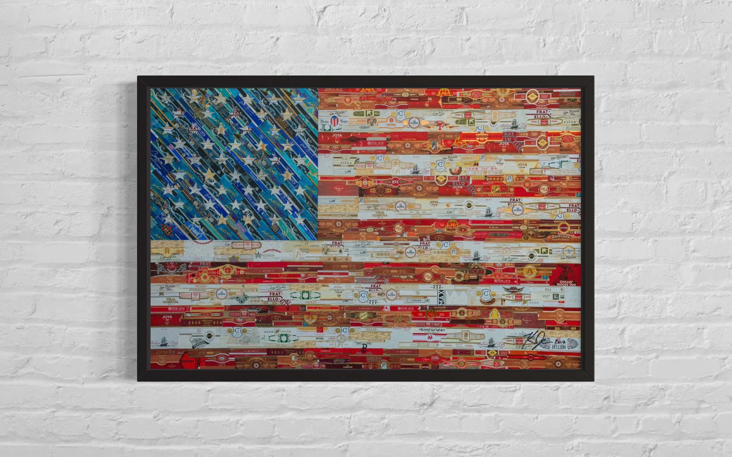 Each stripe and star is carefully assembled from cigar labels, celebrating both craftsmanship and culture while honoring a symbol that resonates deeply with so many. The balance of bold reds, clean whites, and vibrant blues makes it both patriotic and uniquely artistic—an unmistakable statement piece.