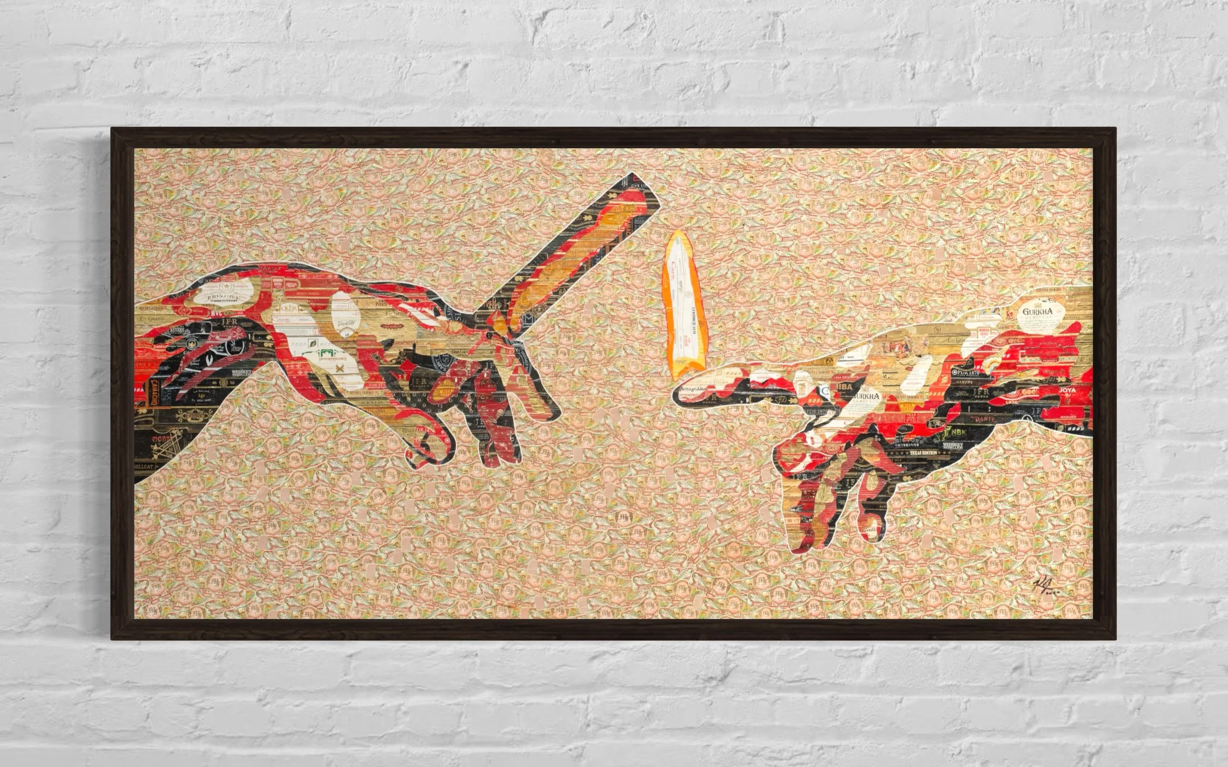 The imagery draws inspiration from the divine spark of creation, reimagined through cigar culture. As a tribute, the entire background is composed solely of My Father cigar labels, symbolizing God’s hand lighting our cigar. The hands themselves are built from a wide variety of labels, blending intricate details into a bold, striking composition.